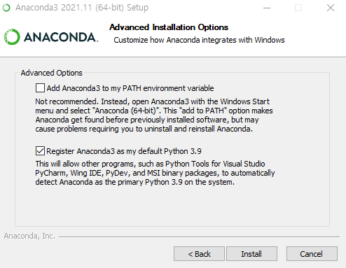 두 번째: 아나콘다에서 제공하는 Python을 다른 프로그램(Visual Studio, PyCharm 등)에서 디폴트로 사용하는지 여부 → 체크 추천(단, Visual Studio에서 따로 사용하는 Python이 이미 존재하면 체크 안하는 것 추천)