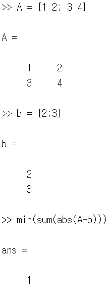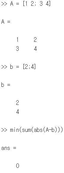 min(sum(abs(A-b))): 행렬 A가 열 벡터 b를 포함하면 0, 아니면 양수