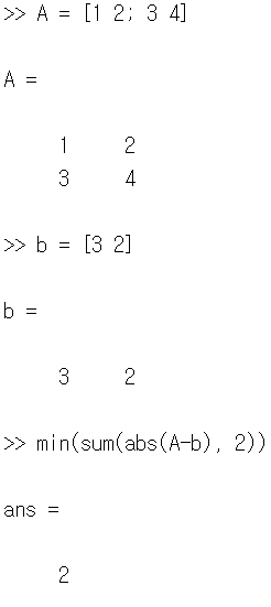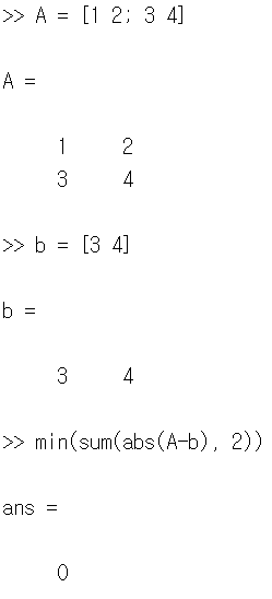 min(sum(abs(A-b), 2)): 행렬 A가 행 벡터 b를 포함하면 0, 아니면 양수