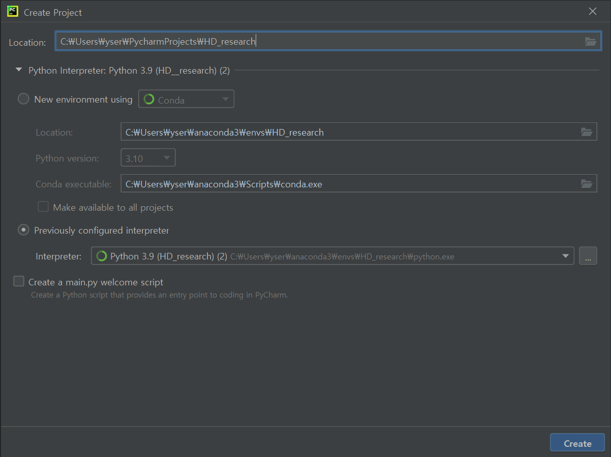 2-2) 이미 생성된 Project에 가상환경 부여하기