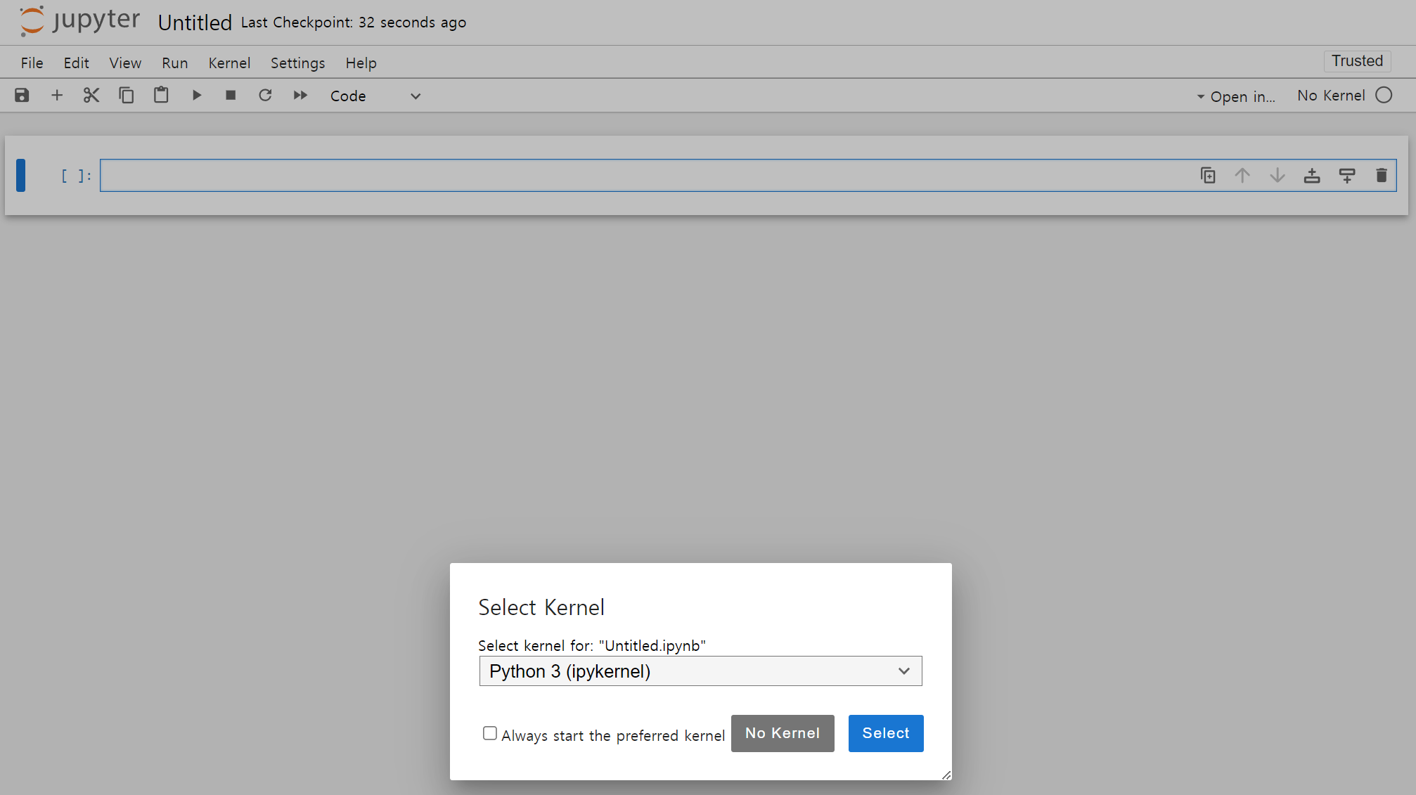 - 그 후 위 그림과 같이 kernel을 선택하게 되어 있다. 가상환경에 맞는 [kernel_name]을 선택하고 'Select'를 누른다.