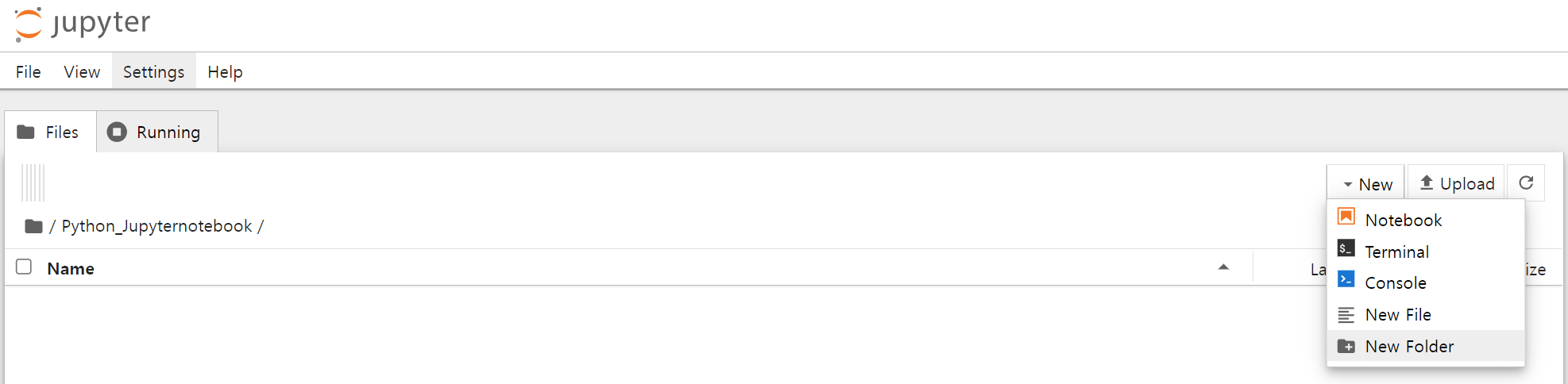 - 위 그림과 같이 jupyter notebook 창이 뜨면 원하는 directory로 간 후 우측 상단의 'New' 버튼을 누르고 'Notebook'을 누른다.